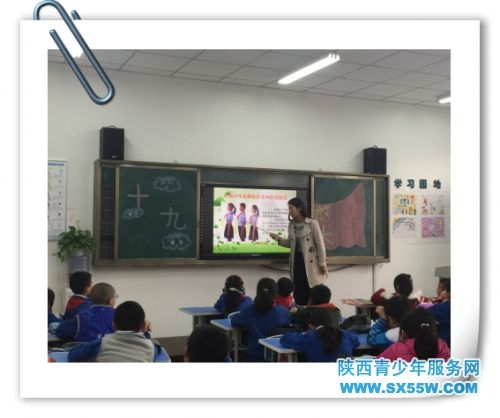 5:未央区夏家堡小学老师带领学生了解中国少年先锋队队长和队委的标志。