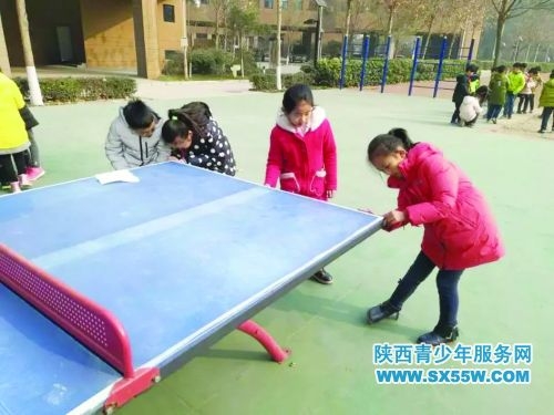 乒乓球案上,学生正在专心地测量着,一个拉着米尺的一头,另一个拽着另一头,还有一个学生做着记录,他们的配合好默契呀!