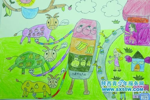 科幻画《水果奶生产机》 作者:西安电子科技大学附属小学二(9)班 周煦扉