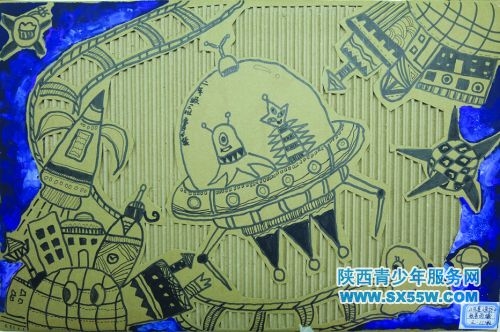 科幻画《外星人来访》 作者:西安电子科技大学附属小学三(2)班 张善雨曦